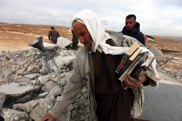 Na fotografia vê-se um homem palestiniano a recuperar livros dos escombros de uma mesquita na passada terça-feira. A mesquita, situada em Yatta, perto de Hebron, Cisjordânia (em território da Palestina) foi destruída por tratores do exército israelita. Segundo os media de Israel o motivo para a destruição é que a mesquita tinha sido construída sem licença (de Israel).